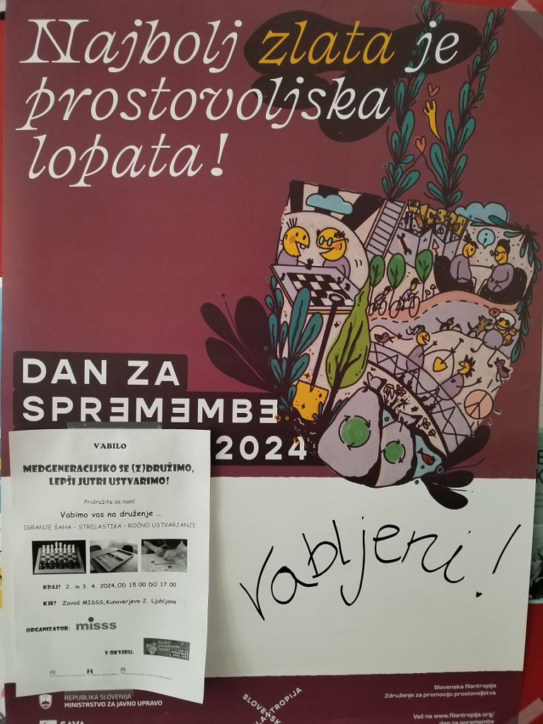 Tudi letos smo se v našem mladinskem centru Skupaj v skupnosti z velikim veseljem pridružili pomembni akciji v sklopu Dneva za spremembe 2024 z naslovom Najbolj zlata je prostovoljska lopata, organizirani s strani Slovenske filantropije. Akcijo smo osnovali pod naslovom – Medgeneracijsko se (z)družimo, lepši jutri ustvarimo!