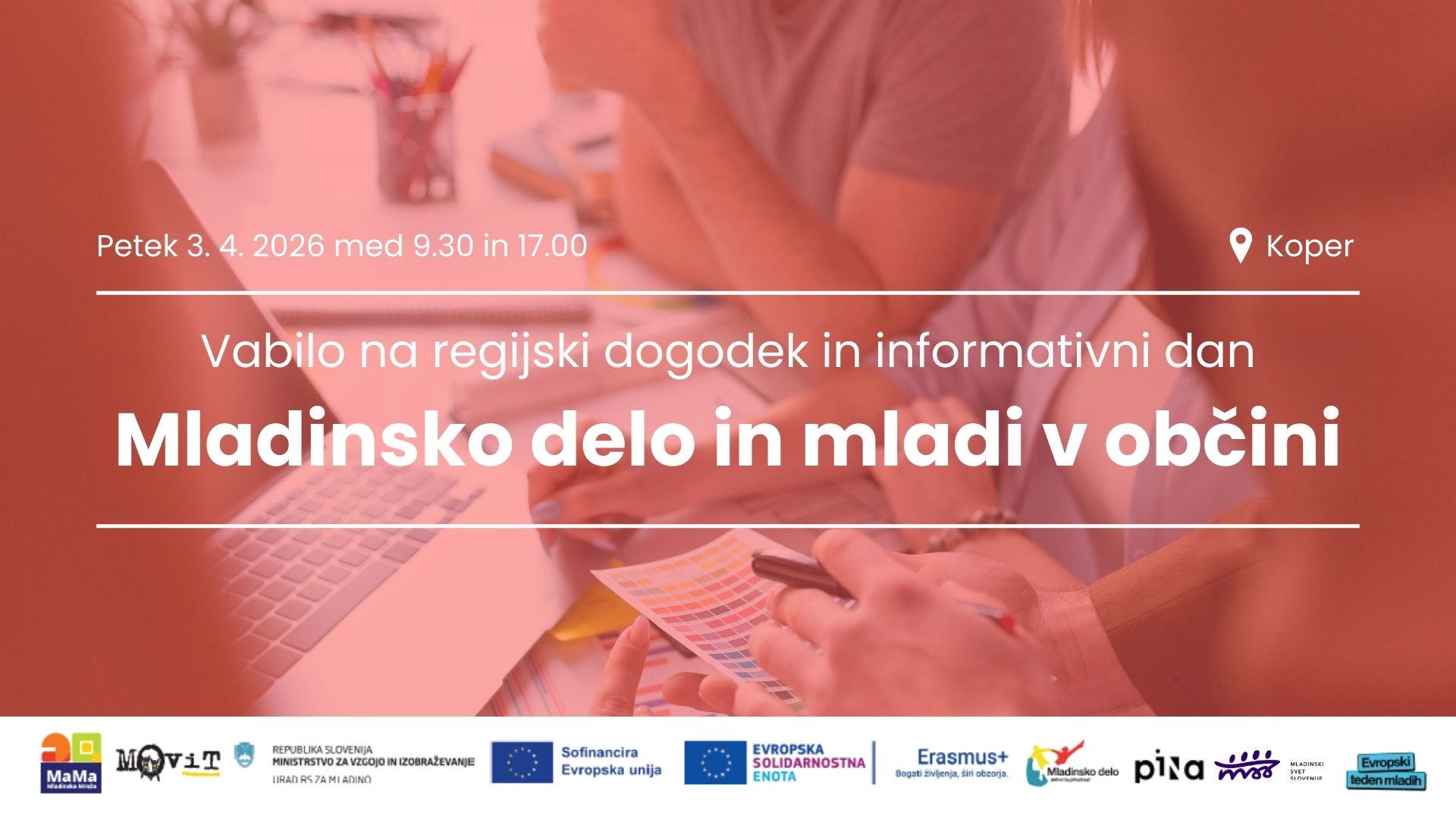3. 4., PiNA (Gortanov trg 15, 6000 Koper) Na dogodek vabljeni vsi, ki soustvarjate prostor za razvoj mladih in kakovostno mladinsko delo na lokalni in regionalni ravni.