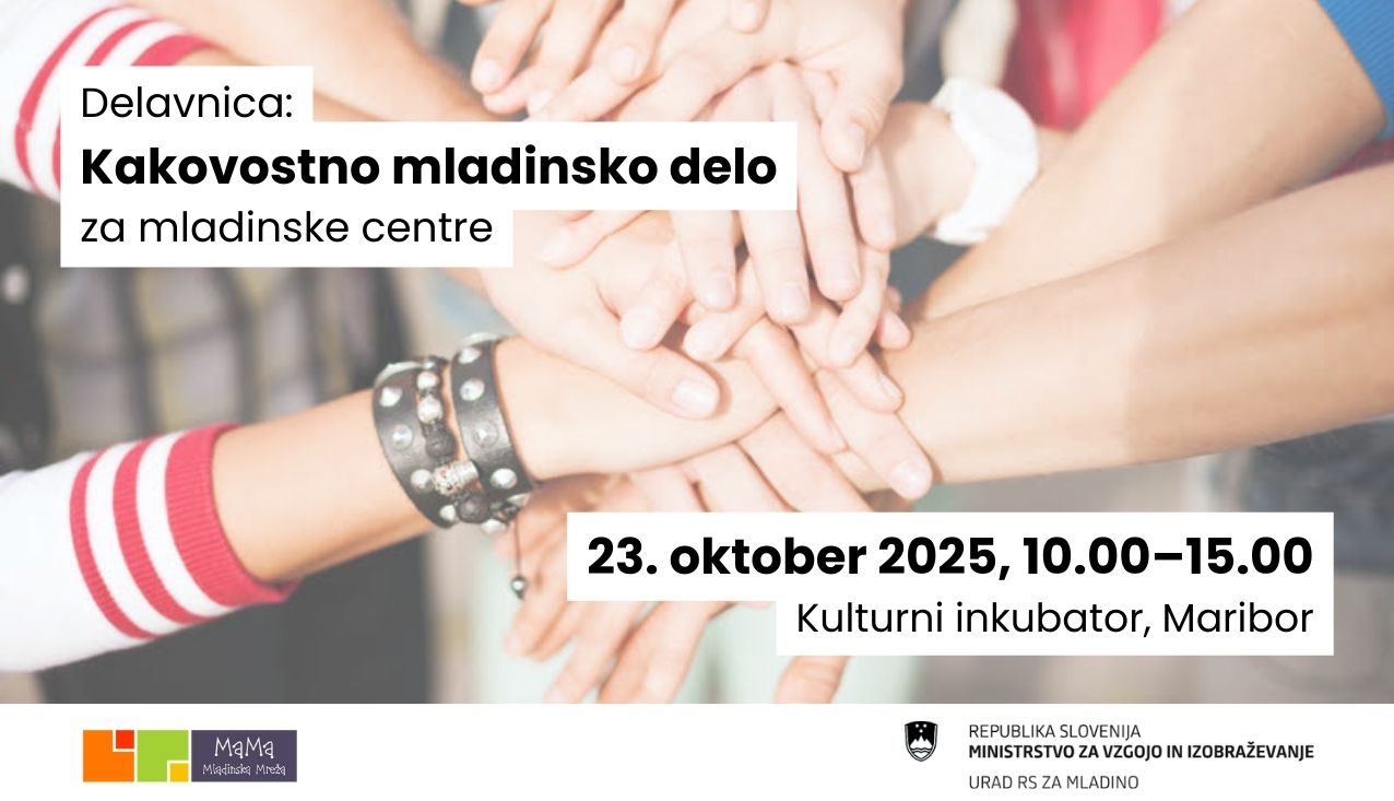 Veseli bomo, če boste z udeležbo na delavnici sodelovali pri nadaljnjem razvoju kakovosti mladinskega dela ter pomagali pri dvigu njegove prepoznavnosti v družbi. Rok za prijavo je ponedeljek, 8. oktober 2025, oziroma do zapolnitve prostih mest (20 udeležencev). Prijave zbiramo preko spletnega obrazca.