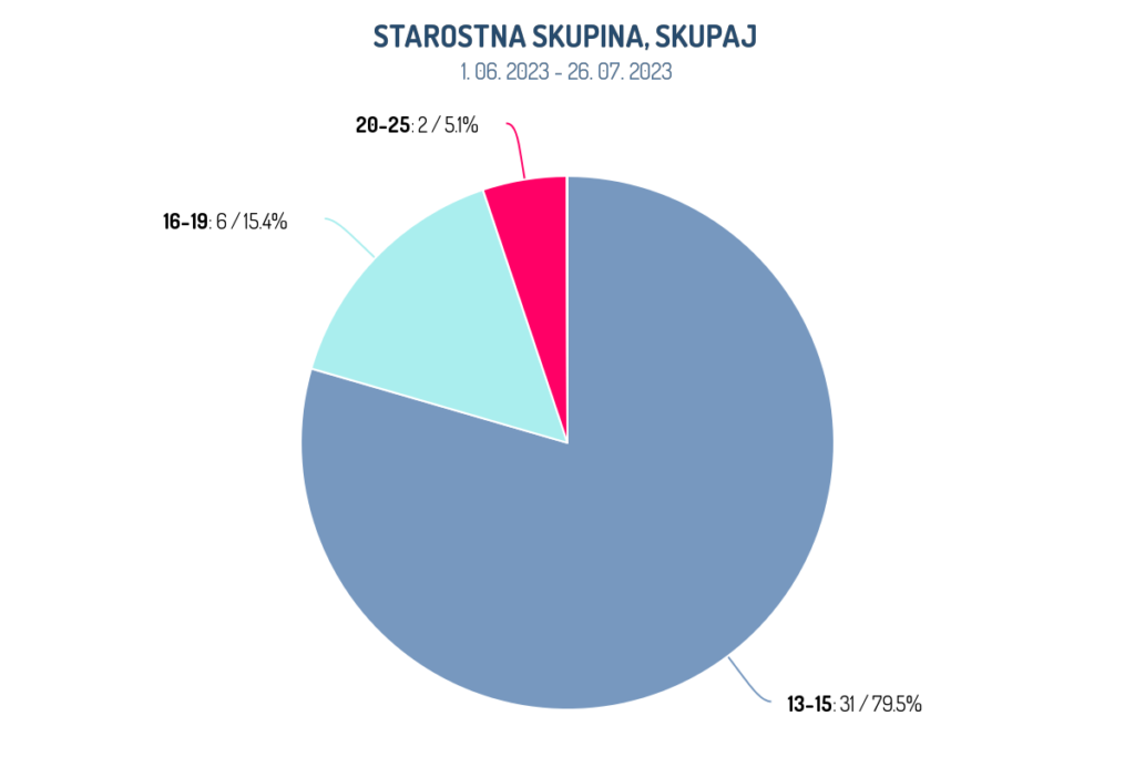 - Največ udeležencev je bilo starih med 13 in 15 let (80%);