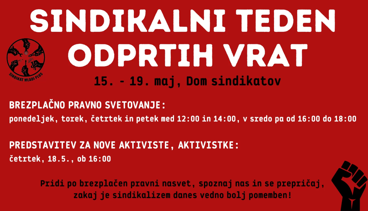 Naš sindikat je precej poseben sindikat in smo nekaj unikatnega ne samo v Sloveniji, ampak tudi na globalni ravni. Spoznaj naše delovanje in se nam pridruži kot aktivist_ka. če te zanima sodelovanje z našim sindikatom, ali pa nas želite le pobliže spoznati, pridite v četrtek, 18. 5., na predstavitev Sindikata Mladi plus, kjer se bomo predstavili, povedali, kaj počnemo, predstavili načine za vključevanje v naše aktivnosti in se seveda tudi podružili. Dobimo se v četrtek 18.5. ob 16:00 v 6. nadstropju Doma sindikatov (Dalmatinova ulica 4, Ljubljana).